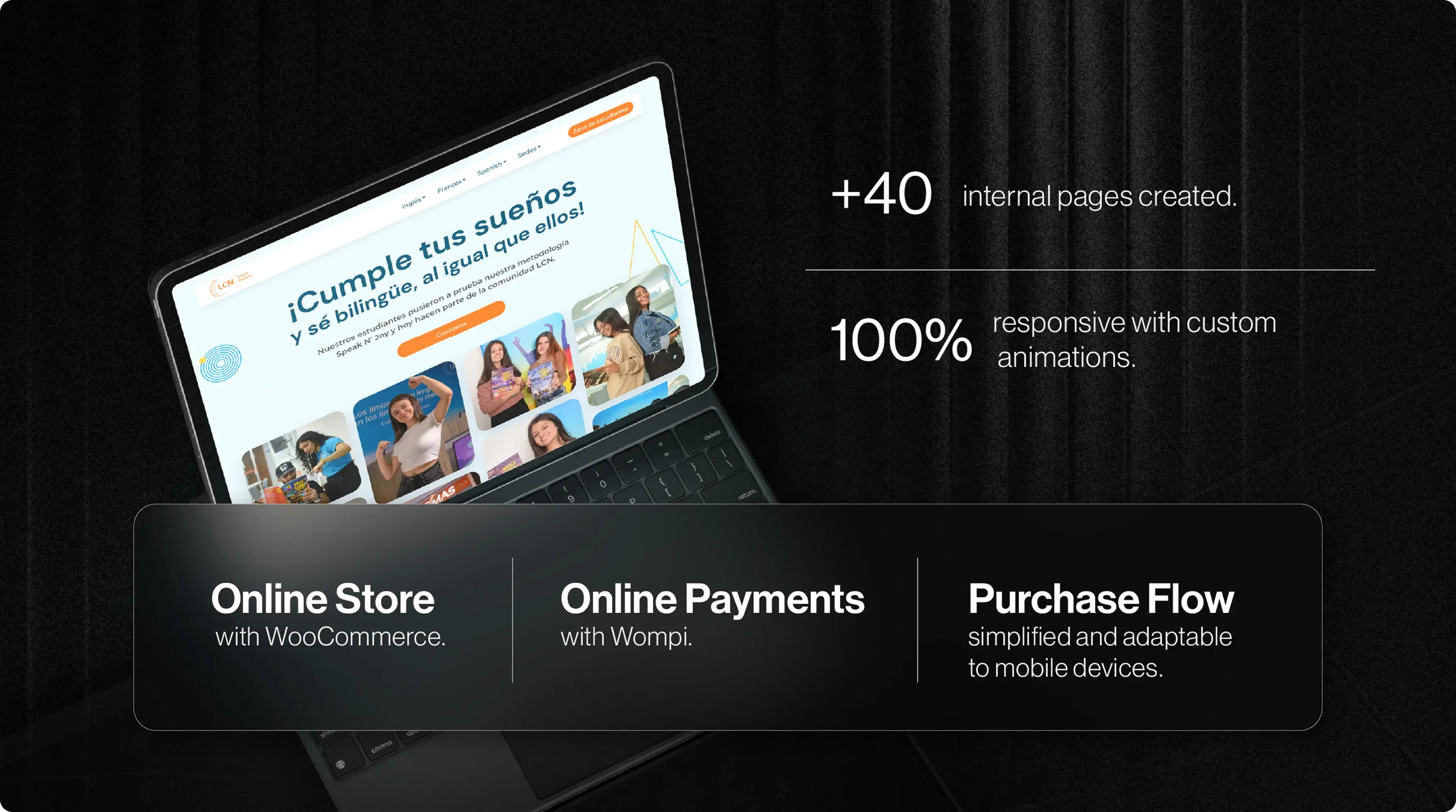 We provide LCN Idiomas with a modern, professional digital platform aligned with its values. The web not only improved the browsing experience and recruitment of new students, but it also facilitated the direct sale of courses, automating processes and allowing the company to scale its services without relying on manual steps.