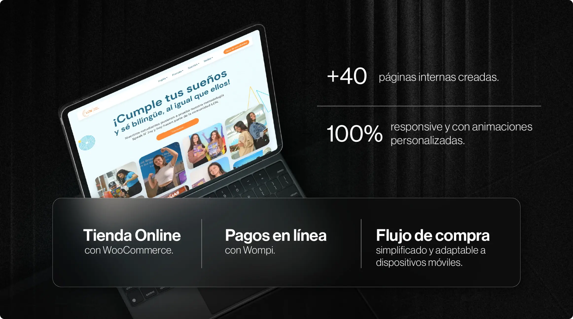 Dotamos a LCN Idiomas de una plataforma digital moderna, profesional y alineada con sus valores. La web no solo mejoró la experiencia de navegación y captación de nuevos alumnos, sino que también facilitó la venta directa de cursos, automatizando procesos y permitiendo a la empresa escalar sus servicios sin depender de pasos manuales.